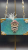 Beautiful blue ab crystal bag has eight gold decorative metal corners. On the front corners there are Swarovski pearls and ivory flowers. In the center is an interchangeable- removable nutcracker brooch. This fun bag is finished off with Swarovski crystal feet and topper. Comes with a decorative handle and a crossbody chain.